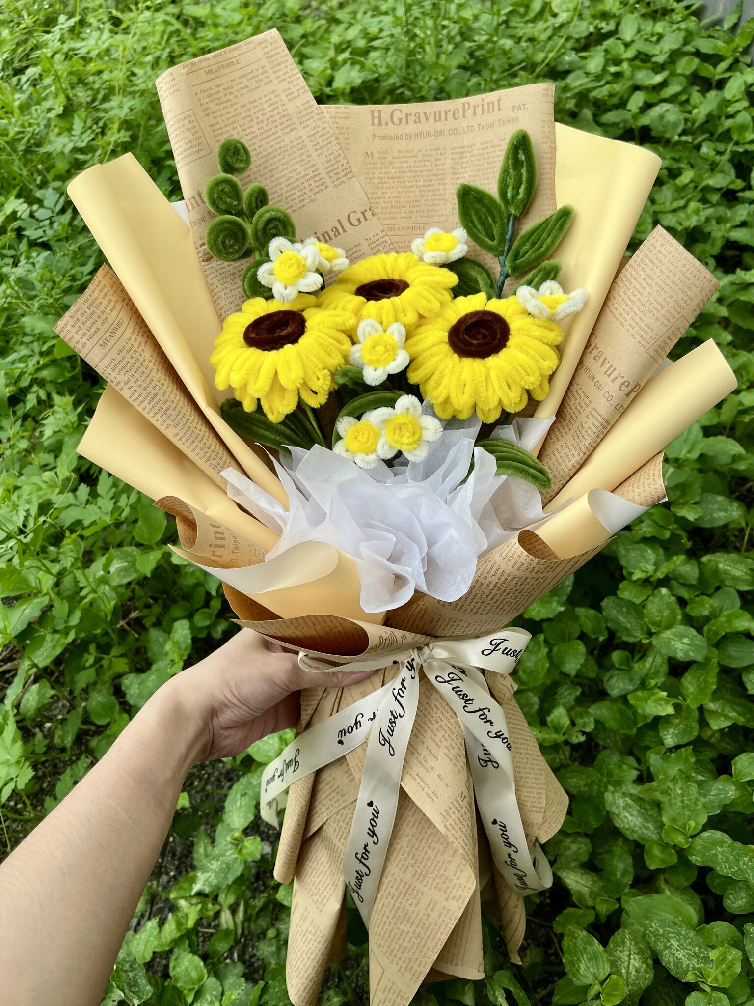 Handcrafted from soft, durable fuzzy wire, these sunflowers capture the bright, happy essence of a real bloom but last forever. The bouquet is expertly arranged with charming filler flowers and wrapped in rustic paper with a delicate ribbon.
