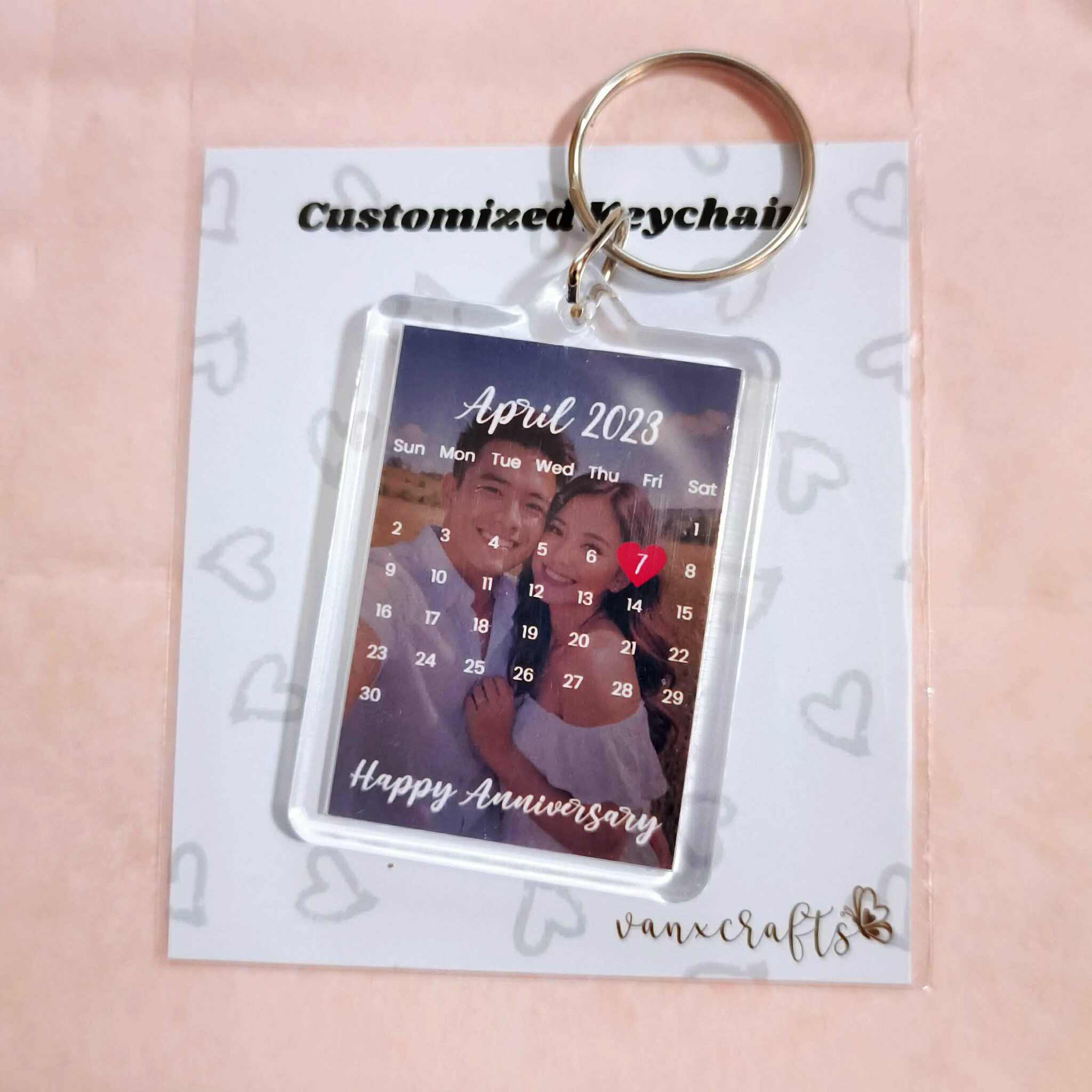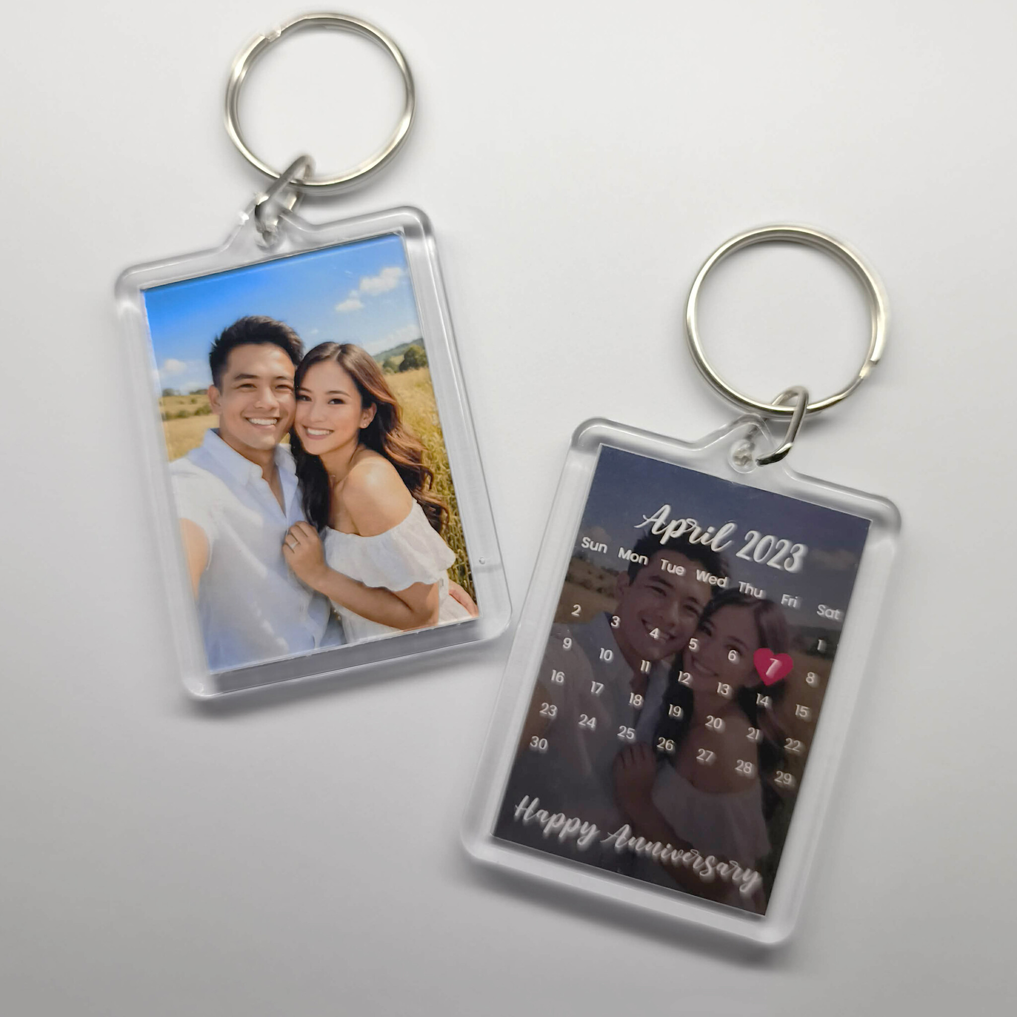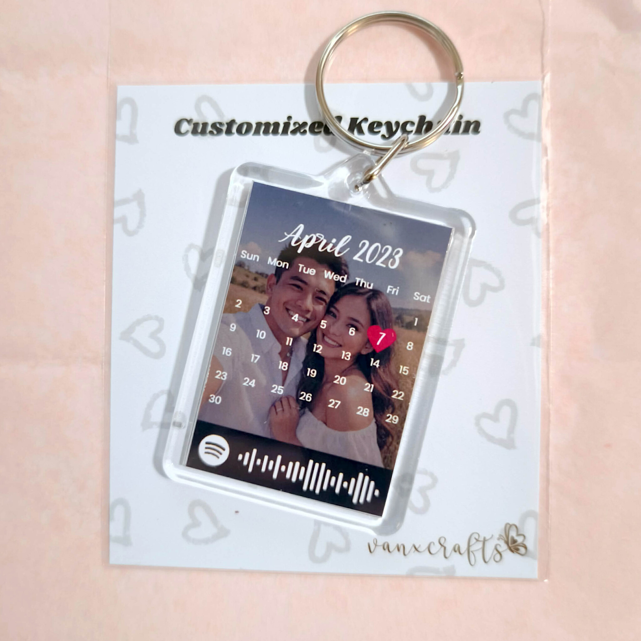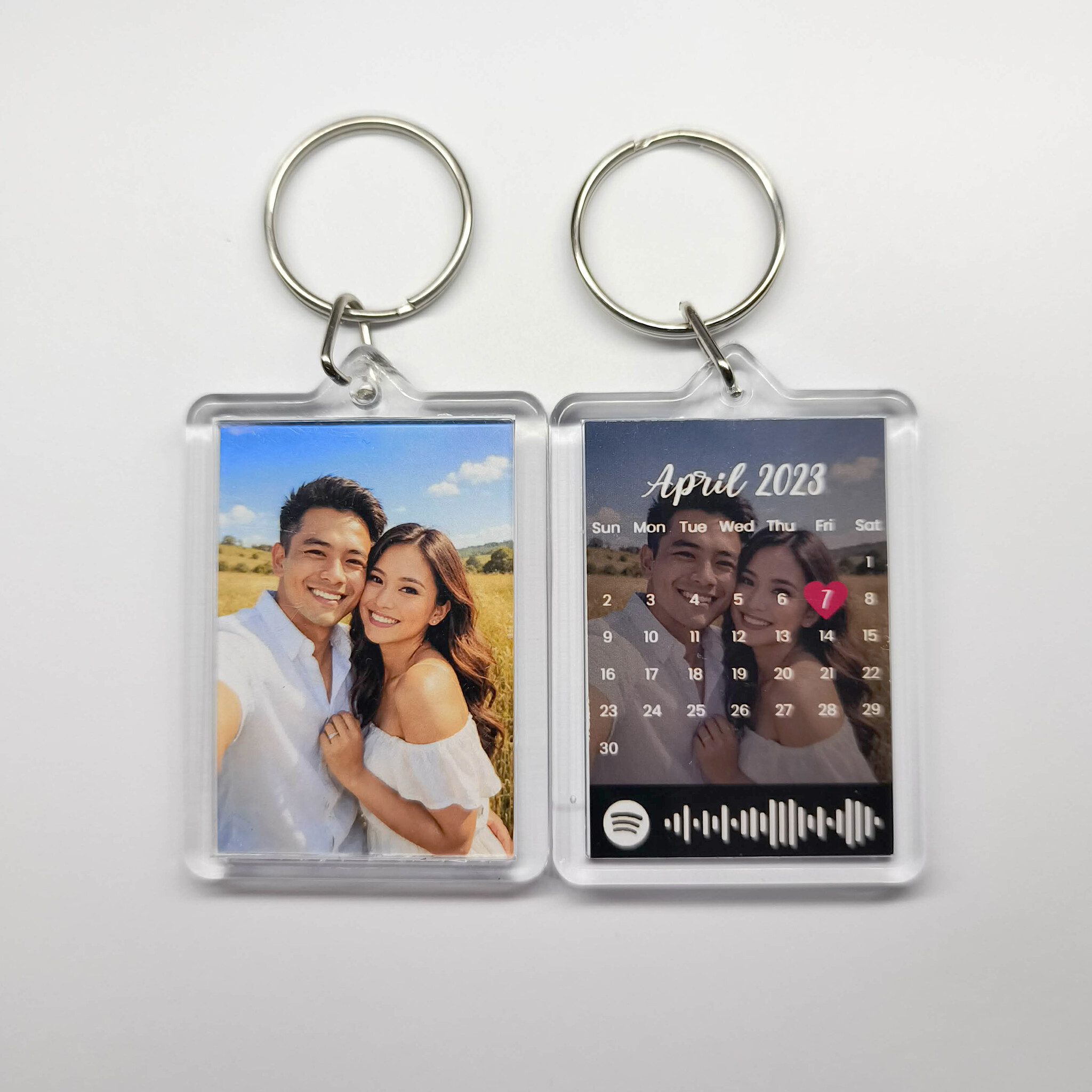 Keep your favorite memory and its soundtrack close. This dual-sided acrylic keychain features a custom photo calendar marked with your special date and a scannable Spotify code that plays your song instantly. Durable, clear, and perfectly personal.